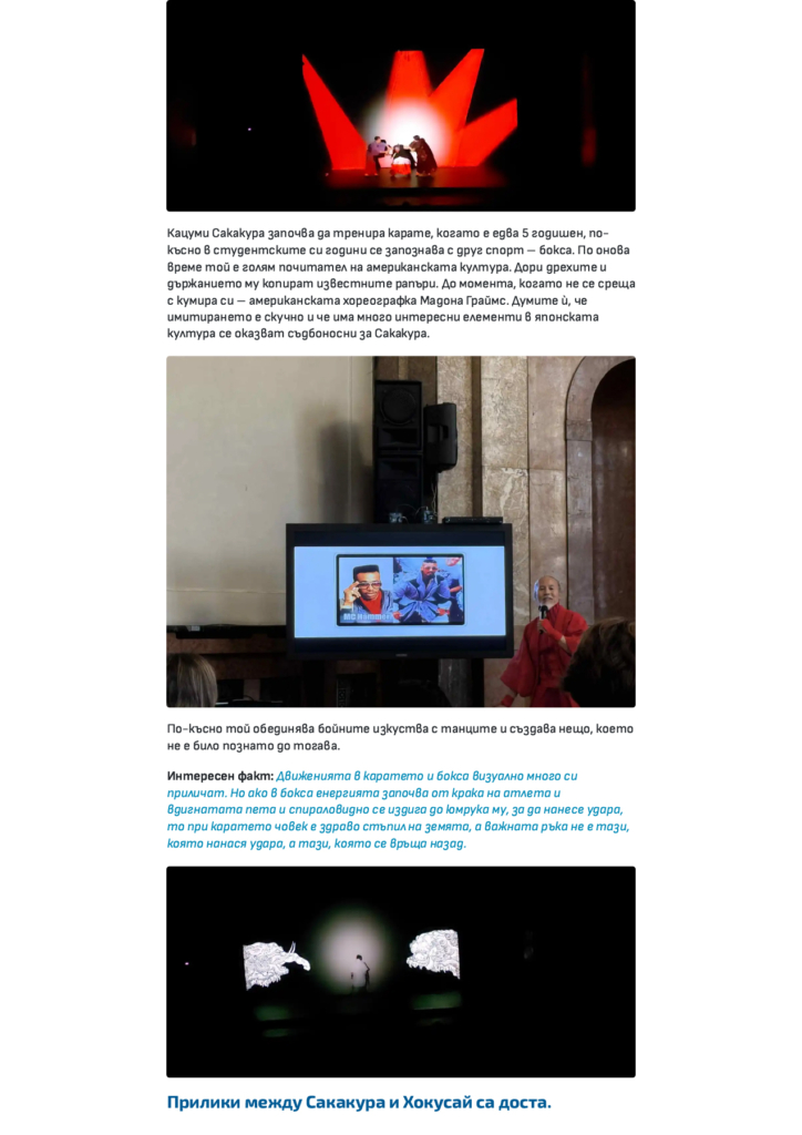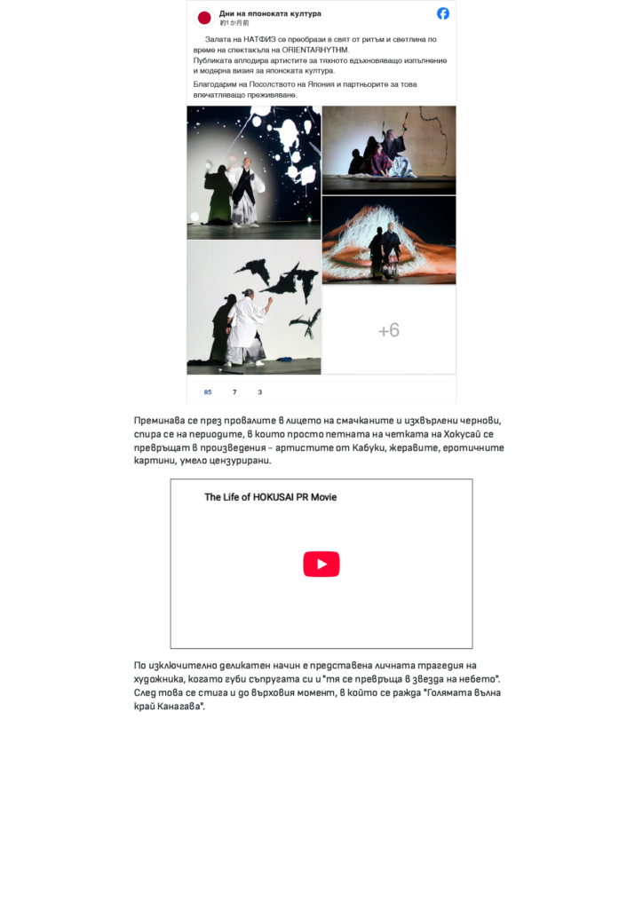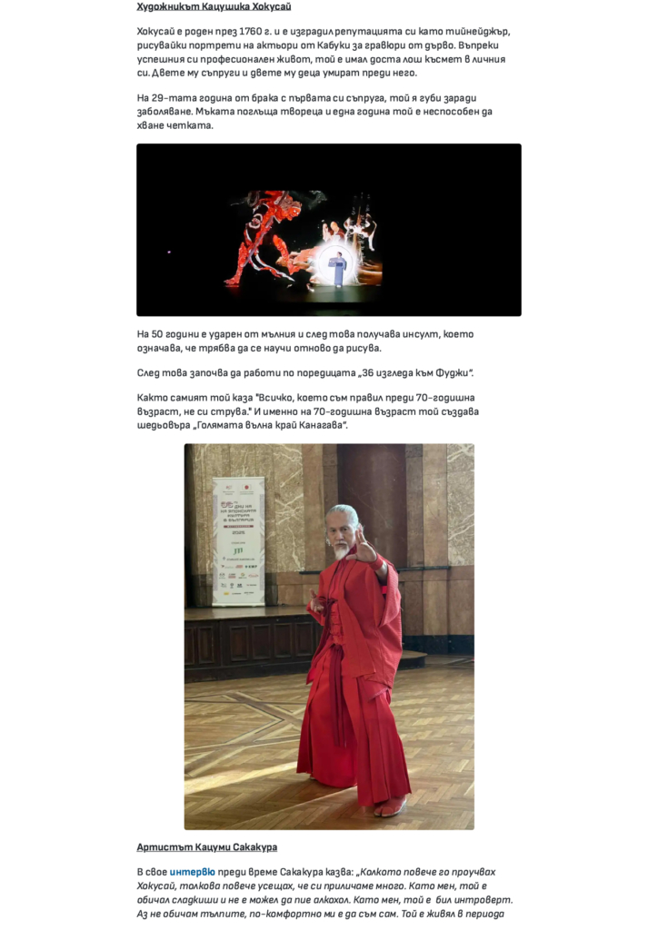 ブルガリアで行いました舞台「The Life of HOKUSAI」についてのインタビュー記事と、ソフィア大学(聖クリメント・オフリドスキ国立大学)での日本文化についての講演会のことがニュースサイトBLITZ Newsに掲載されました。